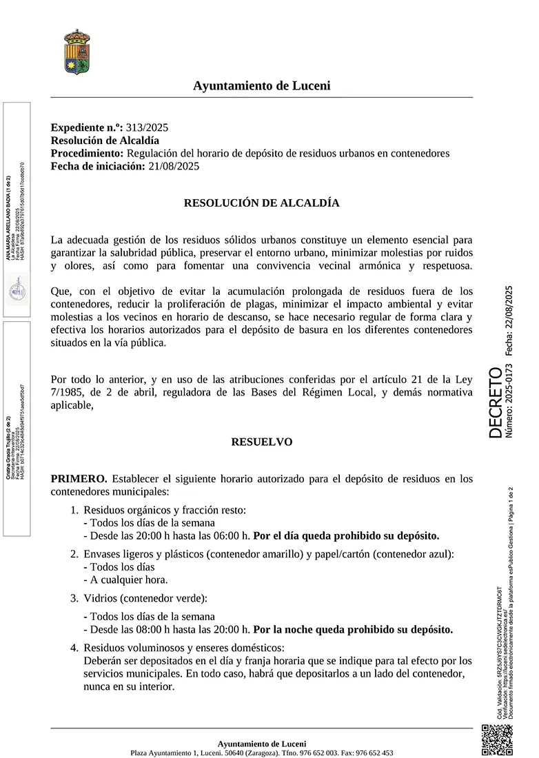 Horario autorizado para el depósito de residuos en los contenedores municipales: