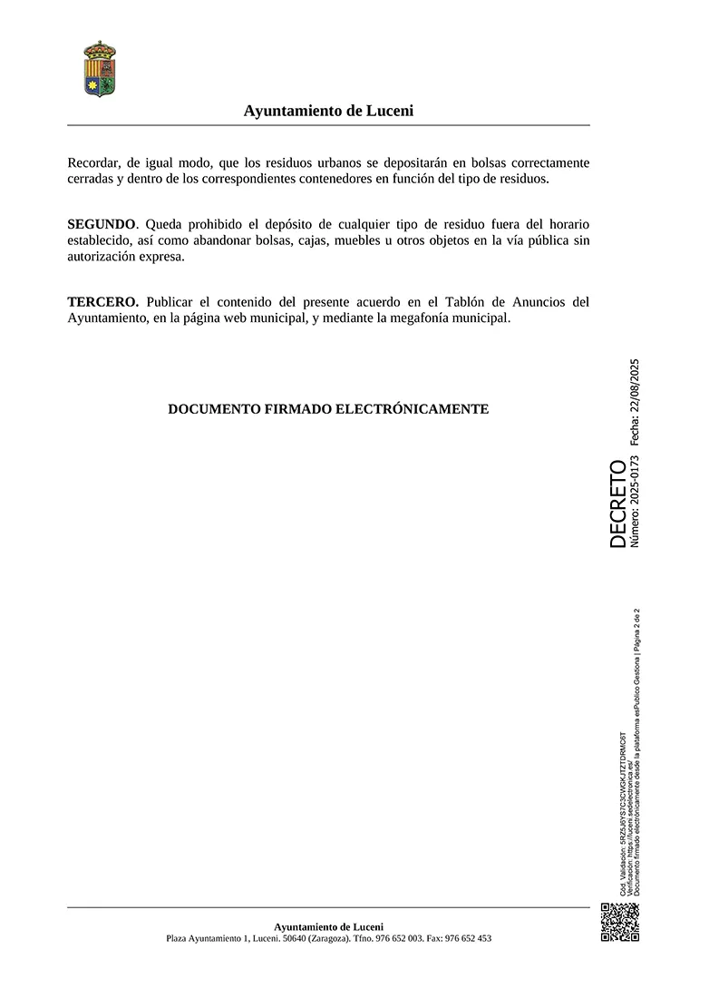Deberán ser depositados en el día y franja horaria que se indique para tal efecto por los servicios municipales. En todo caso, habrá que depositarlos a un lado del contenedor, nunca en su interior.